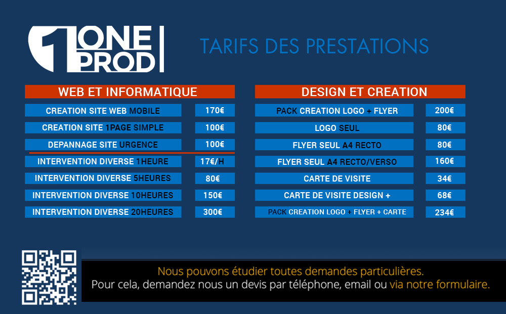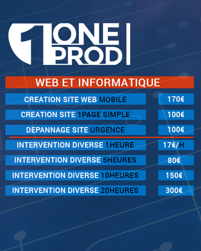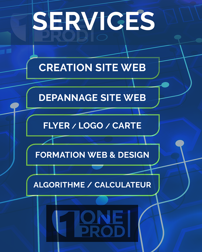 ONEPROD.pro Votre création en ligne Projet de site web, logo, Flyers, Carte de visite, Dépliant, Catalogue, Affiche impactante, Distribution flyers, Algorithme intelligent